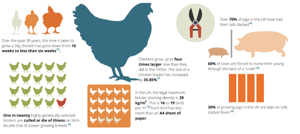 While just over a quarter of the chicken in the UK supply chain is imported, supermarket shelves and takeaway menus are full of industrially produced chicken and pork (the UK saw a 20% increase in pig and poultry units between 2016 and 2023). While most farmers consider animal welfare a top priority, the relentless focus on efficiency in industrial livestock production fundamentally conflicts with providing an enriched life for farmed animals.