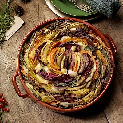 - Layer the slices into a gratin dish, standing up, packed in together, alternating the colours of vegetables. Get creative – it’s Christmas.
